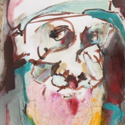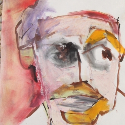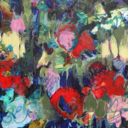 Her abstract compositions of layered, intense, color planes and powerful linear movements are open to figurative or spatial interpretation. Her more figurative drawings invite to relish in colors and the details of her brushwork’s sensuality.